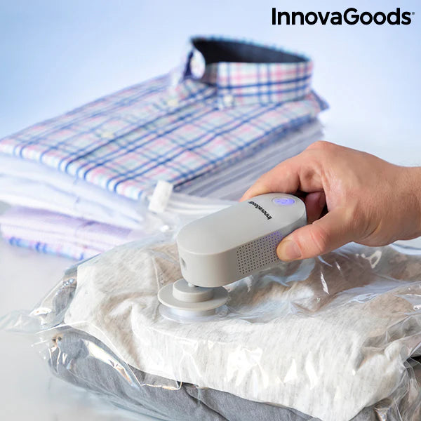 A portable and rechargeable 2-in-1 vacuum pump and inflator with a compact and lightweight multifunction design that hardly takes up space, making it easy carry and use anywhere. It can be used for vacuum packaging, as it extracts air from valve bags for clothes, food, etc. As it can also act as an inflator, it can be used to inflate or deflate sports or aquatic objects (such as balls, floats, etc.). It works in cycles of 10 min and switches off automatically. Includes inflation and suction accessories: 2 metal needles, 1 plastic nozzle for compression function and 2 suction nozzles to adapt to vacuum bags (compatible with all valved vacuum bags).