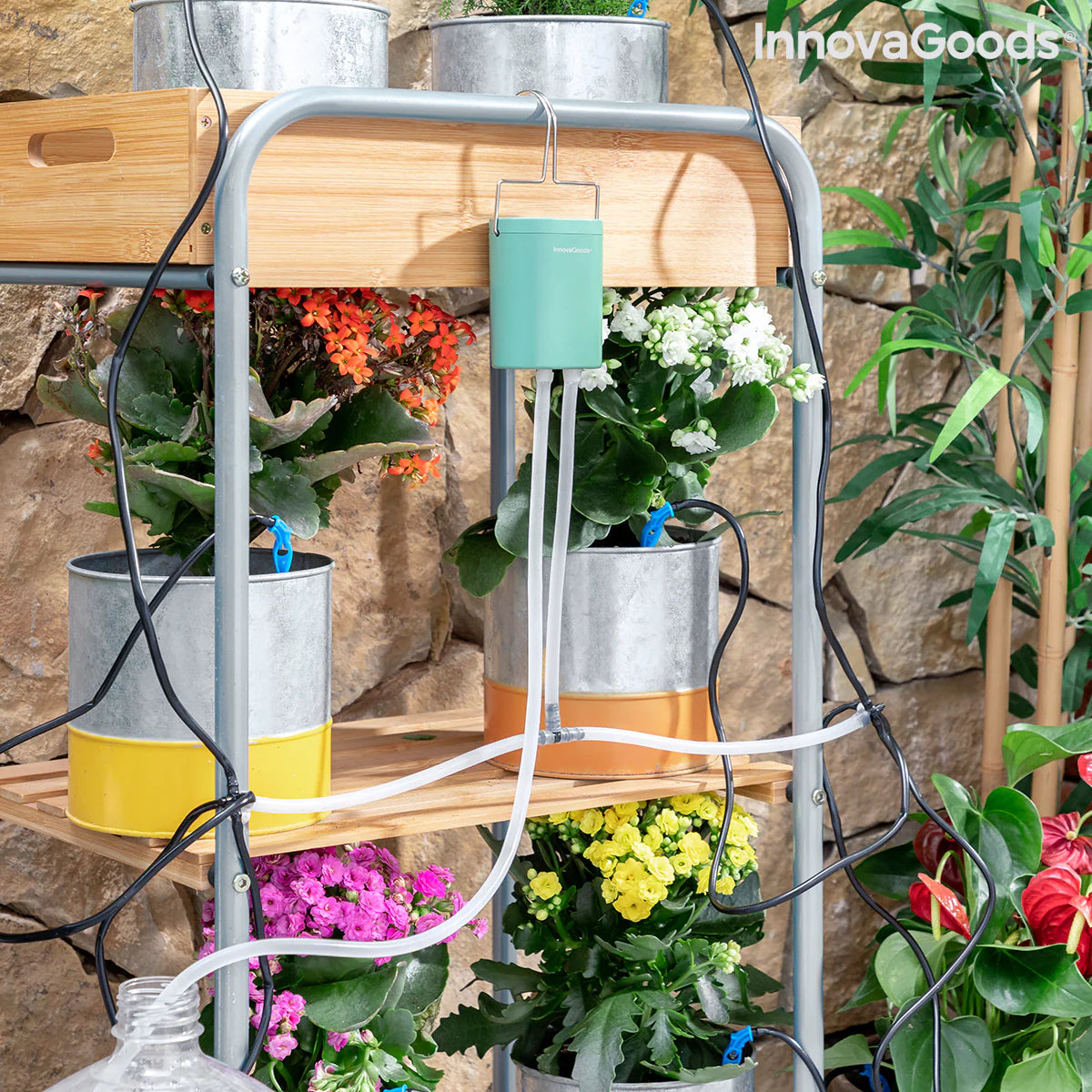 An original and complete automatic drip watering system for plant pots that enables you to simultaneously water up to 8 plants conveniently and simply. In addition to saving water, time and effort, it takes the headache out of having to manually water plants yourself, which is a great help in carrying out this task more easily and safely, without forgetting or it becoming a burden, regularly, or while on holiday, etc. This watering device is rechargeable (includes a USB to micro USB charging cable) and programmable, as it features a digital timer to indicate the gap between watering days (from 1 to 9 days) and the duration of watering desired in seconds. The set includes a metal hanger for the electric device, triple connector accessory (T), hose and watering pipes and 8 watering spikes to insert into the soil of each plant pot. It can be easily installed by following the assembly instructions included. It has a flow of 1200 ml/min (ยฑ100 ml) and the operating temperature is between 5 and 50 ยบC. It also enables you to water manually using one of the buttons on the device. It does not include a water tank for watering.