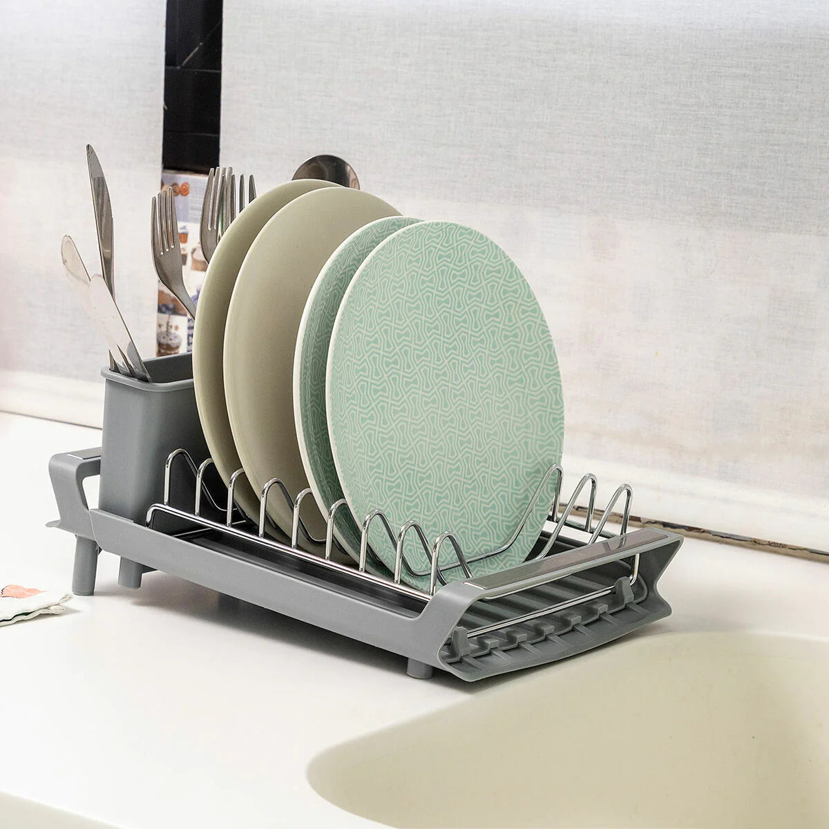 - Portable dish drainer: this modern dish drainer is ideal for drying dishes quickly and conveniently. It features a stainless steel rack with capacity for 8-9 plates placed vertically and a basket with two compartments for cutlery. The rack and basket are removable. The PP base is perfect for glasses and other kitchen utensils.