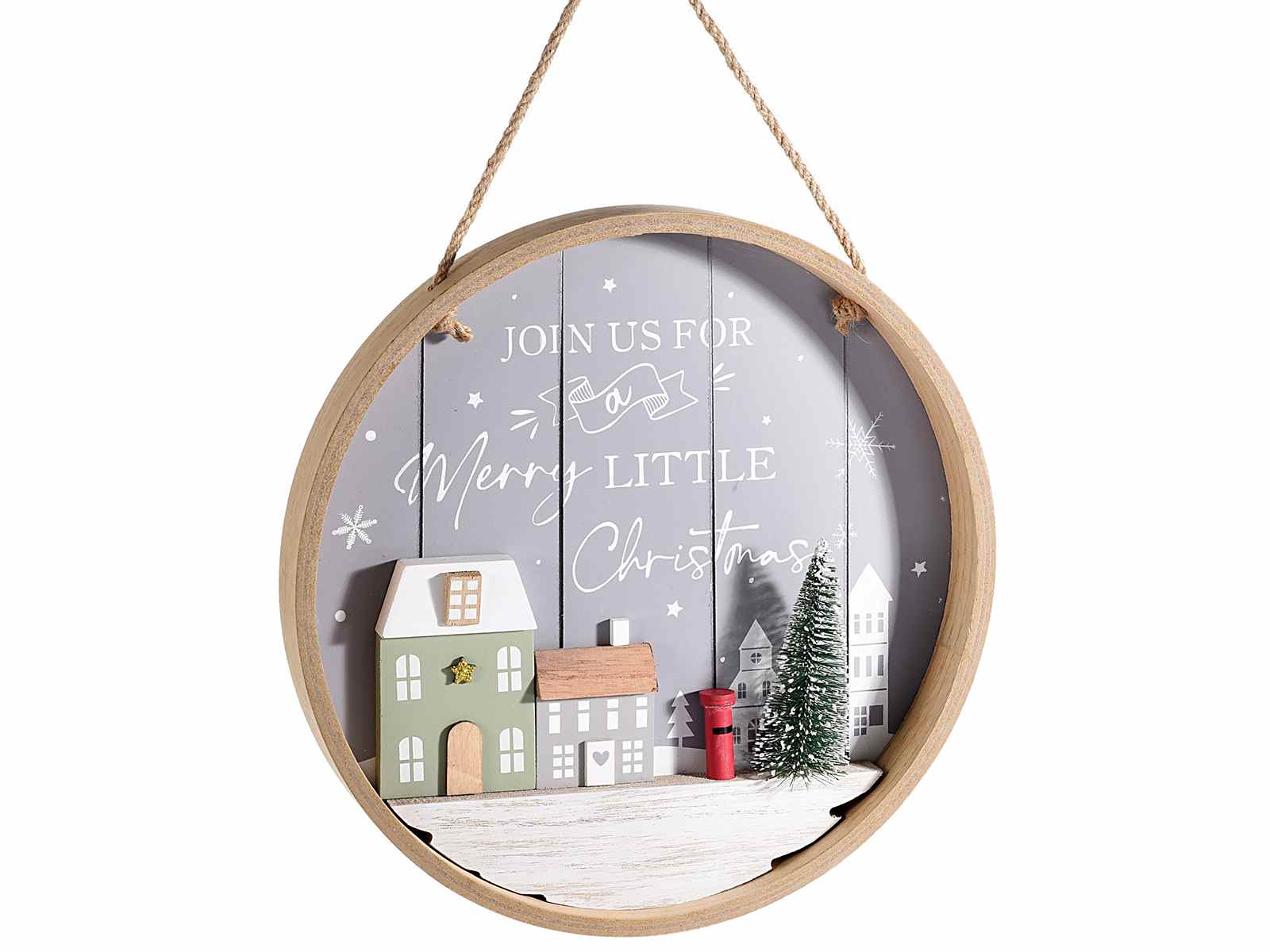 Wooden Christmas pictures with winter landscape and decorative writing to hang