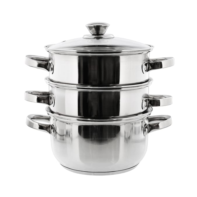 Stainless Steel 3 Tier Steamer is perfect for healthy cooking. The 3 pans are made of stainless steel and the glass lid features a steam hole.