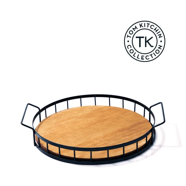 An acacia wood serving tray is a serving tray made from the wood of the acacia tree. Acacia wood is known for its durability, strength, and beautiful natural grain patterns, making it a popular choice for kitchen and dining accessories. the black metal wire raised edges with handles makes transporting your food and beverages safe and easy.